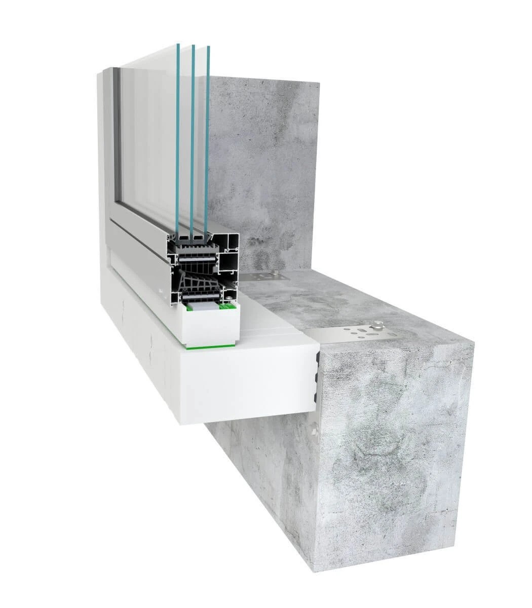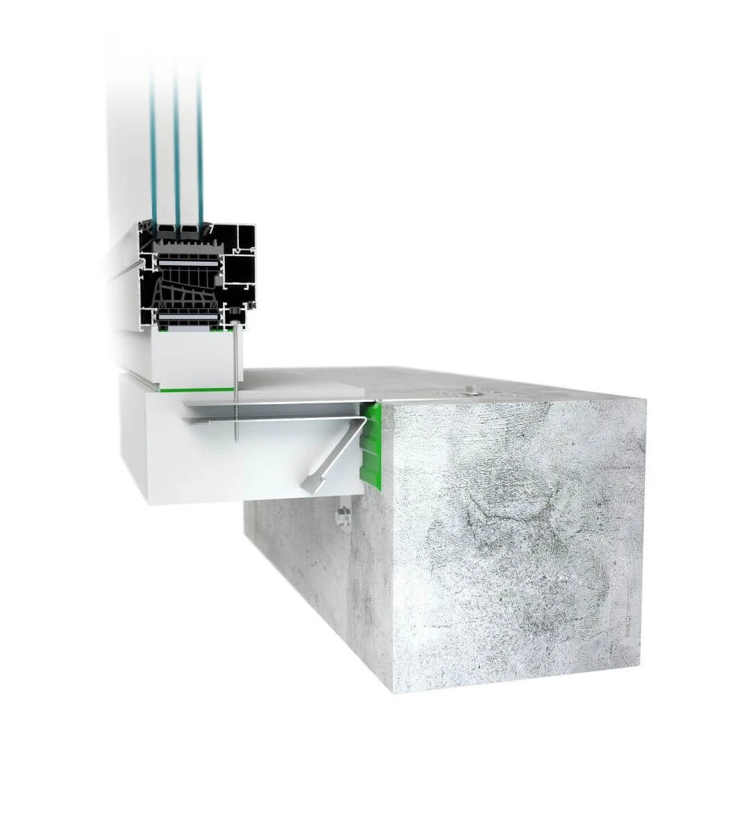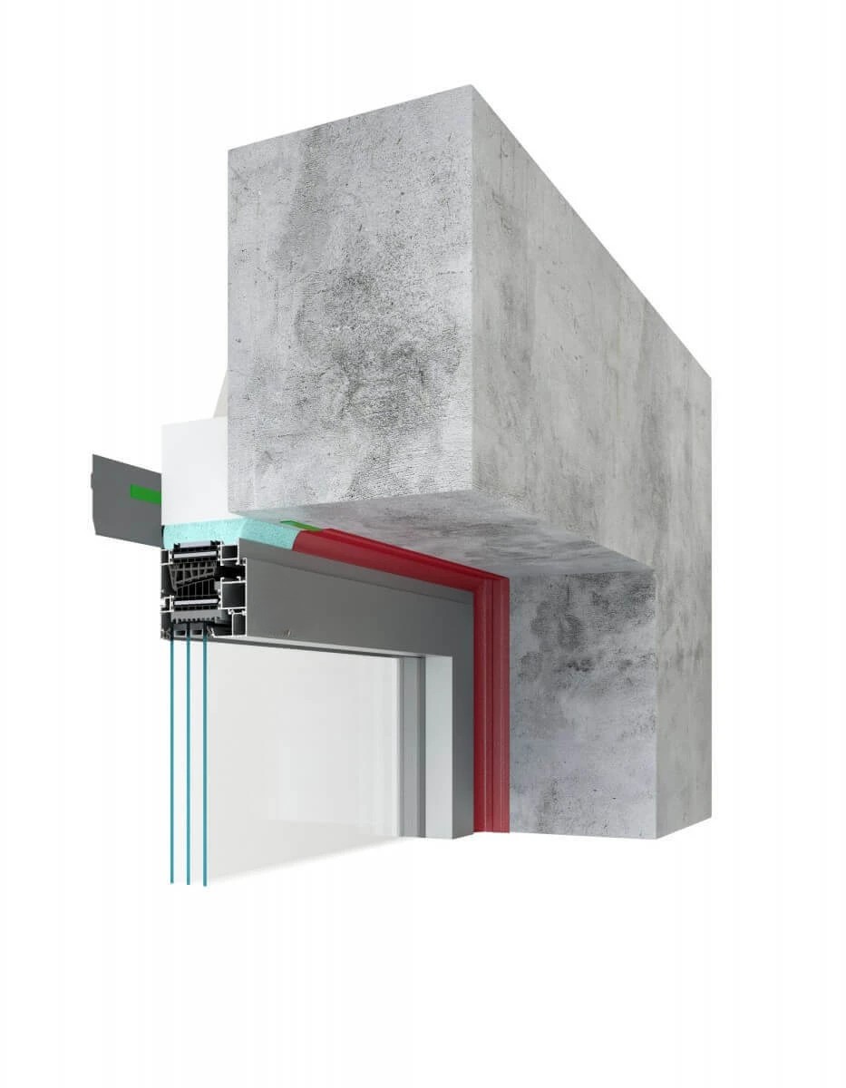 Les bâtiments passifs et économes en énergie cherchent à réduire les pertes de chaleur dues aux ponts thermiques et aux connexions qui fuient. Mais même l'installation des produits de fermeture hautement isolés (fenêtres, portes) peut s'avérer insuffisante. Pour cette raison, il est recommandé d'installer des fenêtres et des portes de balcon dans la zone d'isolation thermique, si possible, prolongées au-delà de la face du mur (déplacées vers la zone d'isolation extérieure du bâtiment), et de relier étroitement les châssis de fenêtres et de portes au mur. Le système MB-Installation Solution garantit une installation simple, rapide et précise. Cette solution est basée sur des composants segmentés en polystyrène dur EPS à très faible conductivité thermique λ = 0,032 W/(m2K). Il s'agit d'élargir l'ouverture de la porte en faisant de ces éléments un châssis de support étanche – c'est comme si l'on mettait les blocs ensemble. Le châssis est constitué de poutres de montage chaudes de 100 ou 200 mm de largeur, équipées de deux types d'ancres systémiques (extérieur ou intérieur). Ces poutres, ainsi que leurs éléments de montage supplémentaires : poutre inférieure, bases de seuil intérieures et extérieures et autres éléments de jonction tels que les colles, mousses PU, éléments de jonction et rubans d'étanchéité, assurent une installation étanche et facile des fenêtres et portes fabriquées à l'aide les systèmes VM.